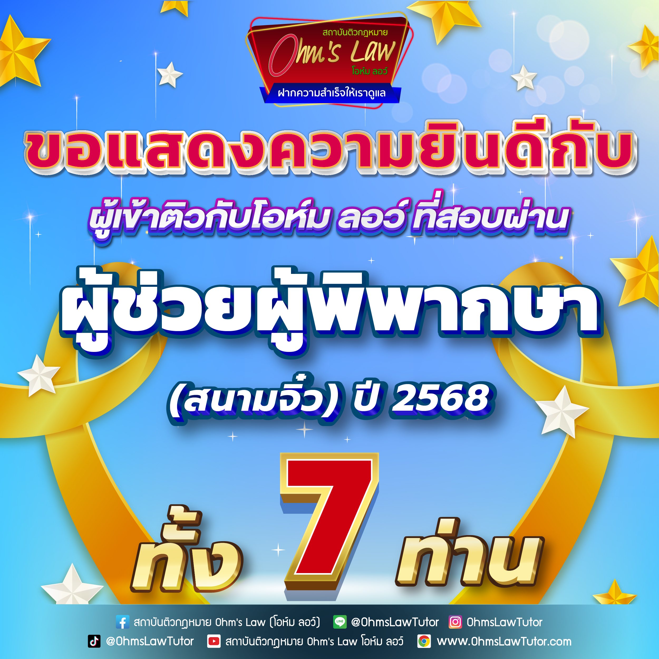 🌟 สถาบันติวกฎหมาย Ohm’s Law (โอห์ม ลอว์) ของผู้เข้าติวกับโอห์ม ลอว์ ทั้ง 7 ท่าน ที่สอบผ่านข้อเขียนในการสอบ “ผู้ช่วยผู้พิพากษา (สนามจิ๋ว) ปี 2568” ที่ประกาศผลสอบไปวันนี้ (ประกาศ ณ วันที่ 9 ม.ค. 69 จำนวนผู้สอบผ่านข้อเขียนตามประกาศทั้งหมด 26 ท่าน) ✨