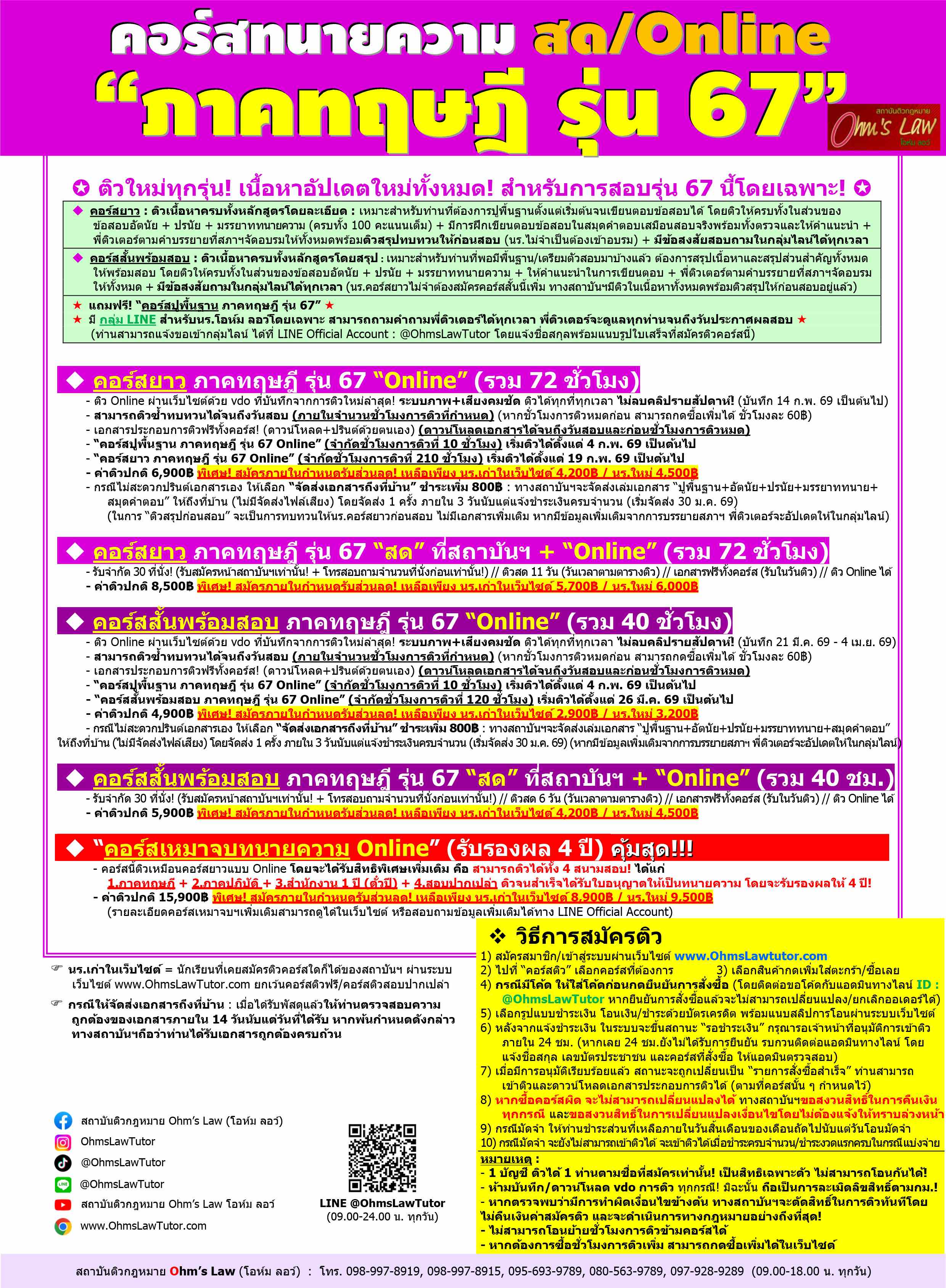 "คอร์สสั้นพร้อมสอบ ทนายความ ภาคทฤษฎี รุ่น 67 สด/Online" (จำกัดชั่วโมงการติวที่ 120 ชั่วโมง)