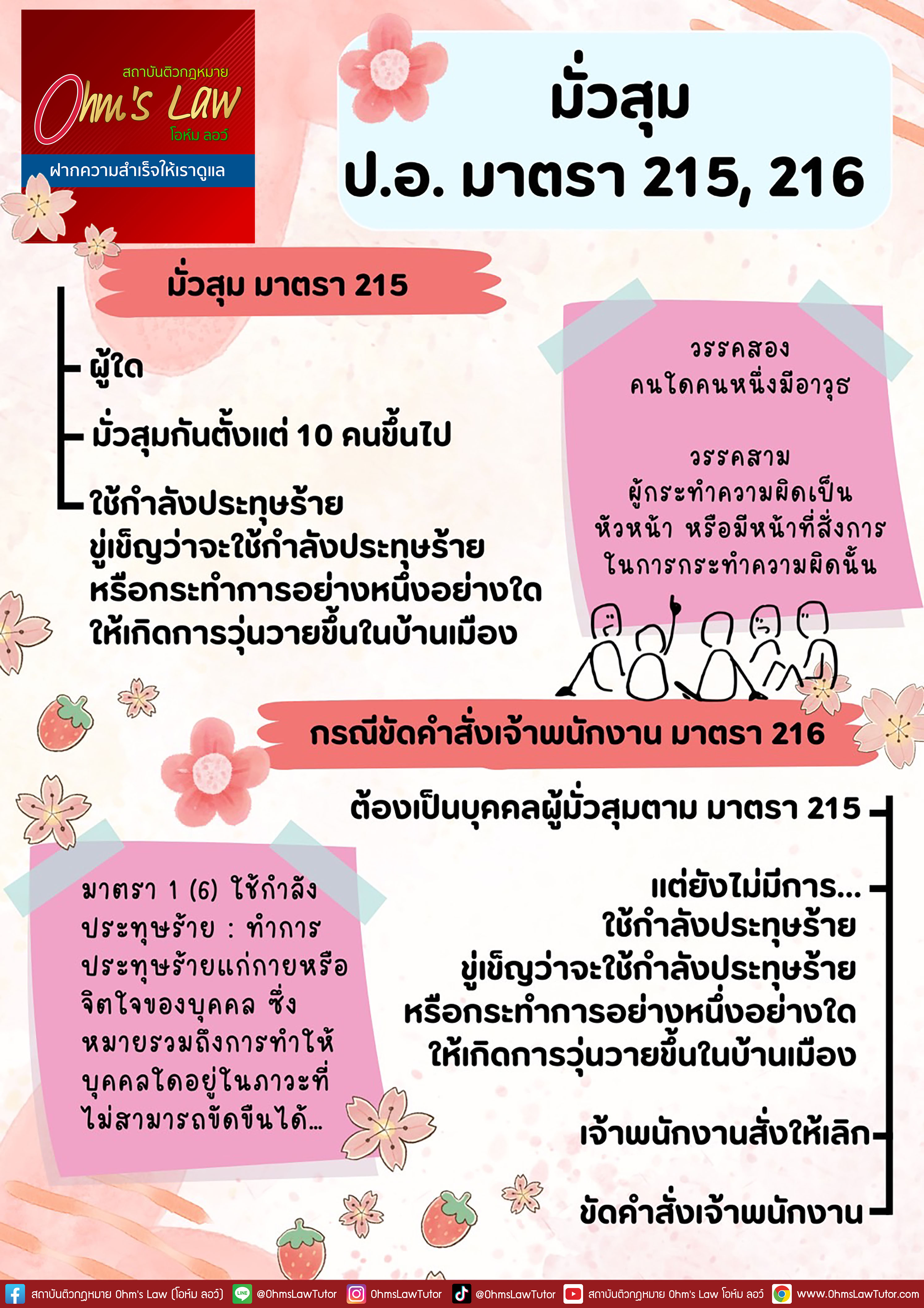 📎 มาตรา 216 เมื่อเจ้าพนักงานสั่งผู้ที่มั่วสุมเพื่อกระทำความผิดตามมาตรา 215 ให้เลิกไป ผู้ใดไม่เลิก ต้องระวางโทษจำคุกไม่เกินสามปี หรือปรับไม่เกินหกหมื่นบาท หรือทั้งจำทั้งปรับ คำพิพากษาที่เกี่ยวข้อง