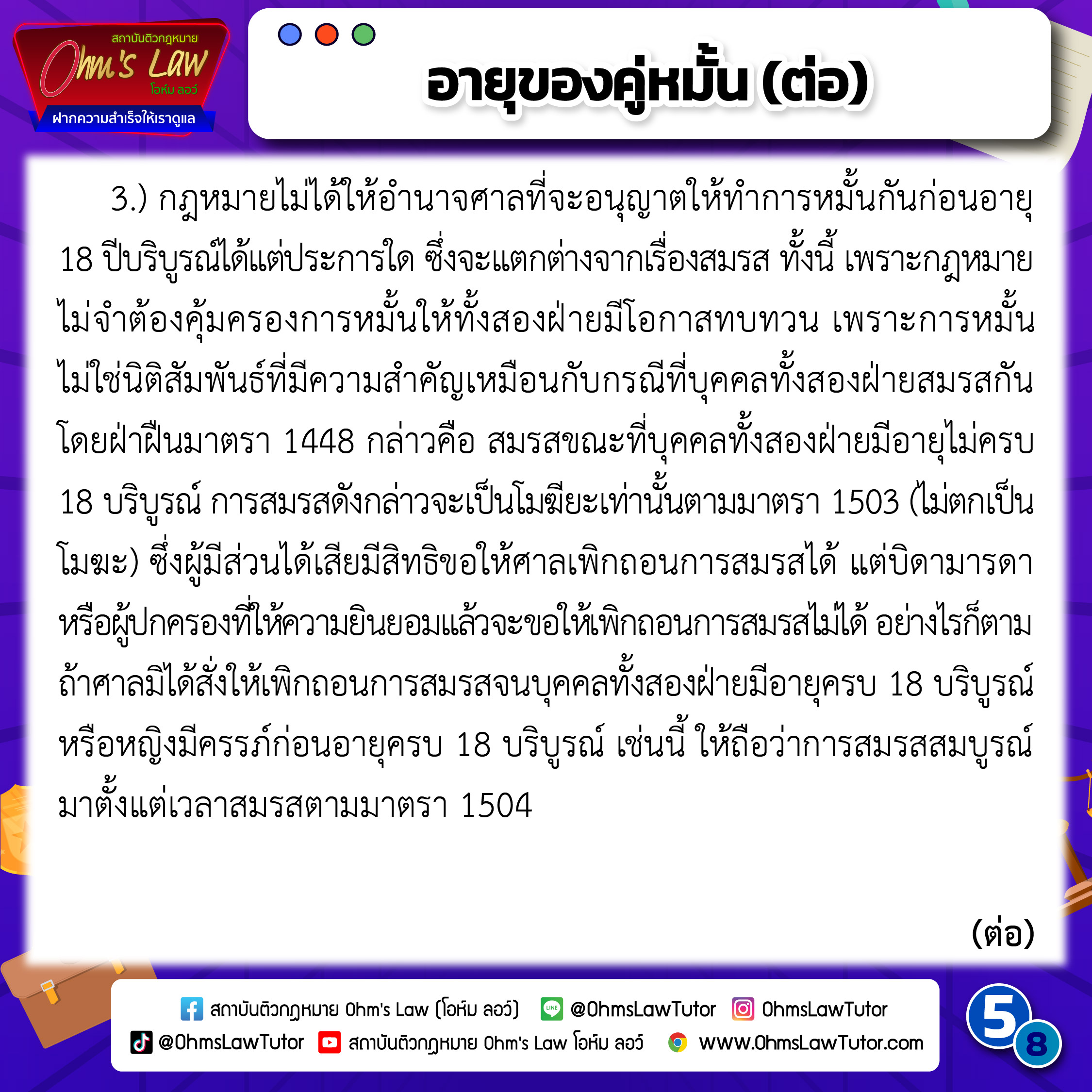3.) กฎหมายไม่ได้ให้อำนาจศาลที่จะอนุญาตให้ทำการหมั้นกันก่อนอายุ 18 ปีบริบูรณ์ได้แต่ประการใด ซึ่งจะแตกต่างจากเรื่องสมรส ทั้งนี้ เพราะกฎหมายไม่จำต้องคุ้มครองการหมั้นให้ทั้งสองฝ่ายมีโอกาสทบทวน เพราะการหมั้นไม่ใช่นิติสัมพันธ์ที่มีความสำคัญเหมือนกับกรณีที่บุคคลทั้งสองฝ่ายสมรสกันโดยฝ่าฝืนมาตรา 1448 กล่าวคือ สมรสขณะที่บุคคลทั้งสองฝ่ายมีอายุไม่ครบ 18 บริบูรณ์ การสมรสดังกล่าวจะเป็นโมฆียะเท่านั้นตามมาตรา 1503 (ไม่ตกเป็นโมฆะ) ซึ่งผู้มีส่วนได้เสียมีสิทธิขอให้ศาลเพิกถอนการสมรสได้ แต่บิดามารดาหรือผู้ปกครองที่ให้ความยินยอมแล้วจะขอให้เพิกถอนการสมรสไม่ได้ อย่างไรก็ตาม ถ้าศาลมิได้สั่งให้เพิกถอนการสมรสจนบุคคลทั้งสองฝ่ายมีอายุครบ 18 บริบูรณ์ หรือหญิงมีครรภ์ก่อนอายุครบ 18 บริบูรณ์ เช่นนี้ ให้ถือว่าการสมรสสมบูรณ์มาตั้งแต่เวลาสมรสตามมาตรา 1504