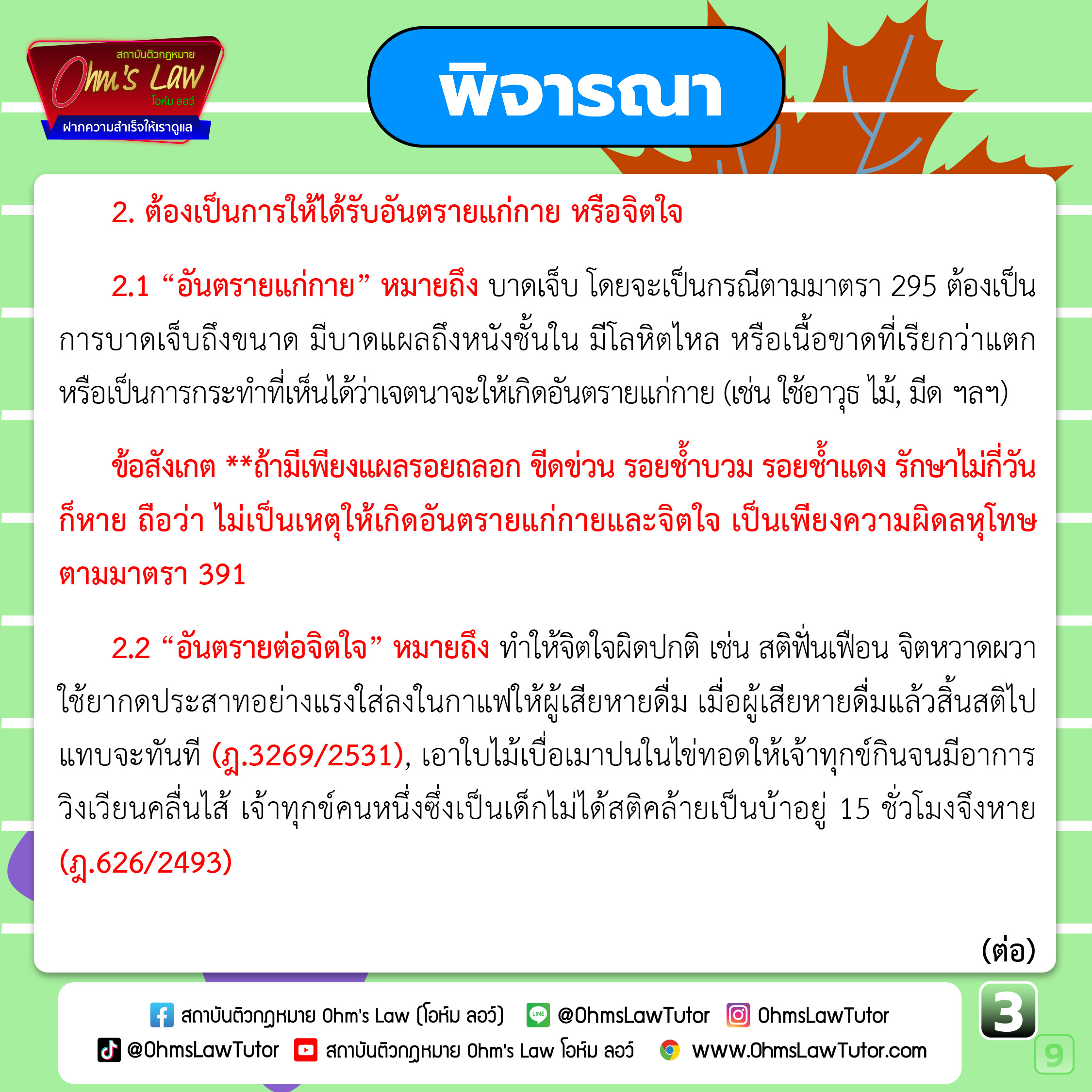 ข้อสังเกต **ถ้ามีเพียงแผลรอยถลอก ขีดข่วน รอยช้ำบวม รอยช้ำแดง รักษาไม่กี่วันก็หาย ถือว่า ไม่เป็นเหตุให้เกิดอันตรายแก่กายและจิตใจ เป็นเพียงความผิดลหุโทษ ตามมาตรา 391