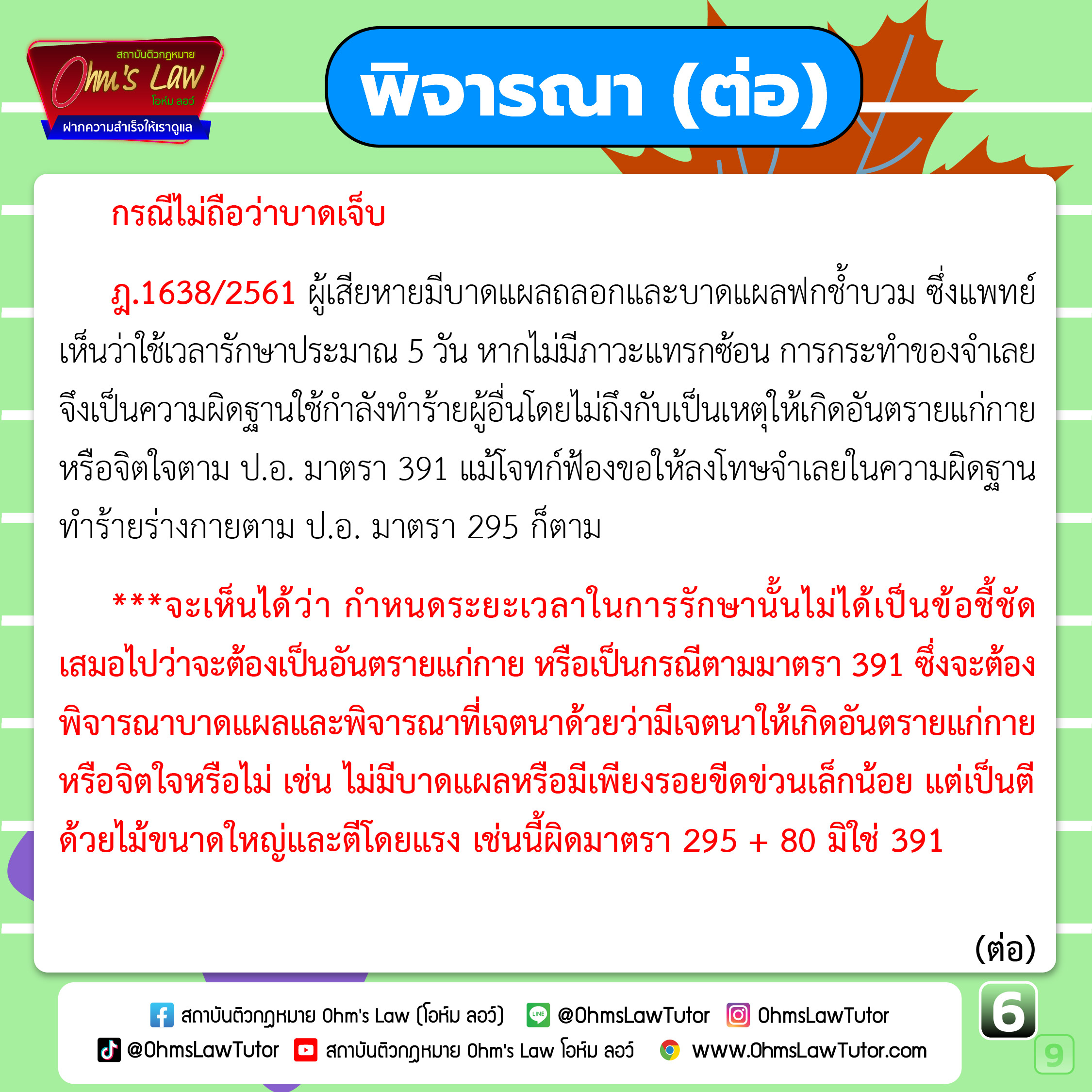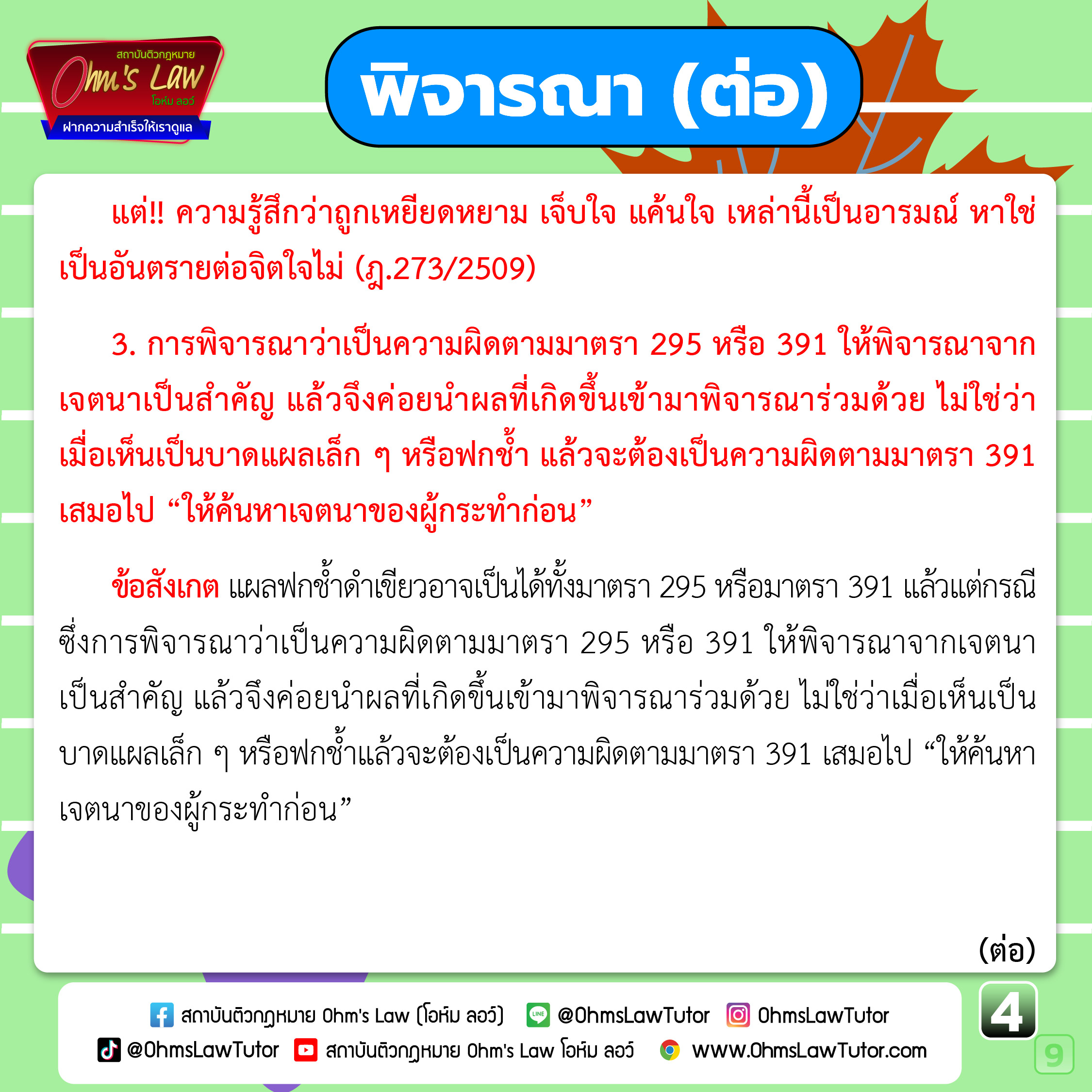 3️⃣ การพิจารณาว่าเป็นความผิดตามมาตรา 295 หรือ 391 ให้พิจารณาจากเจตนาเป็นสำคัญ แล้วจึงค่อยนำผลที่เกิดขึ้นเข้ามาพิจารณาร่วมด้วย ไม่ใช่ว่า เมื่อเห็นเป็นบาดแผลเล็ก ๆ หรือฟกช้ำ แล้วจะต้องเป็นความผิดตาม มาตรา 391 เสมอไป “ให้ค้นหาเจตนาของผู้กระทำก่อน”