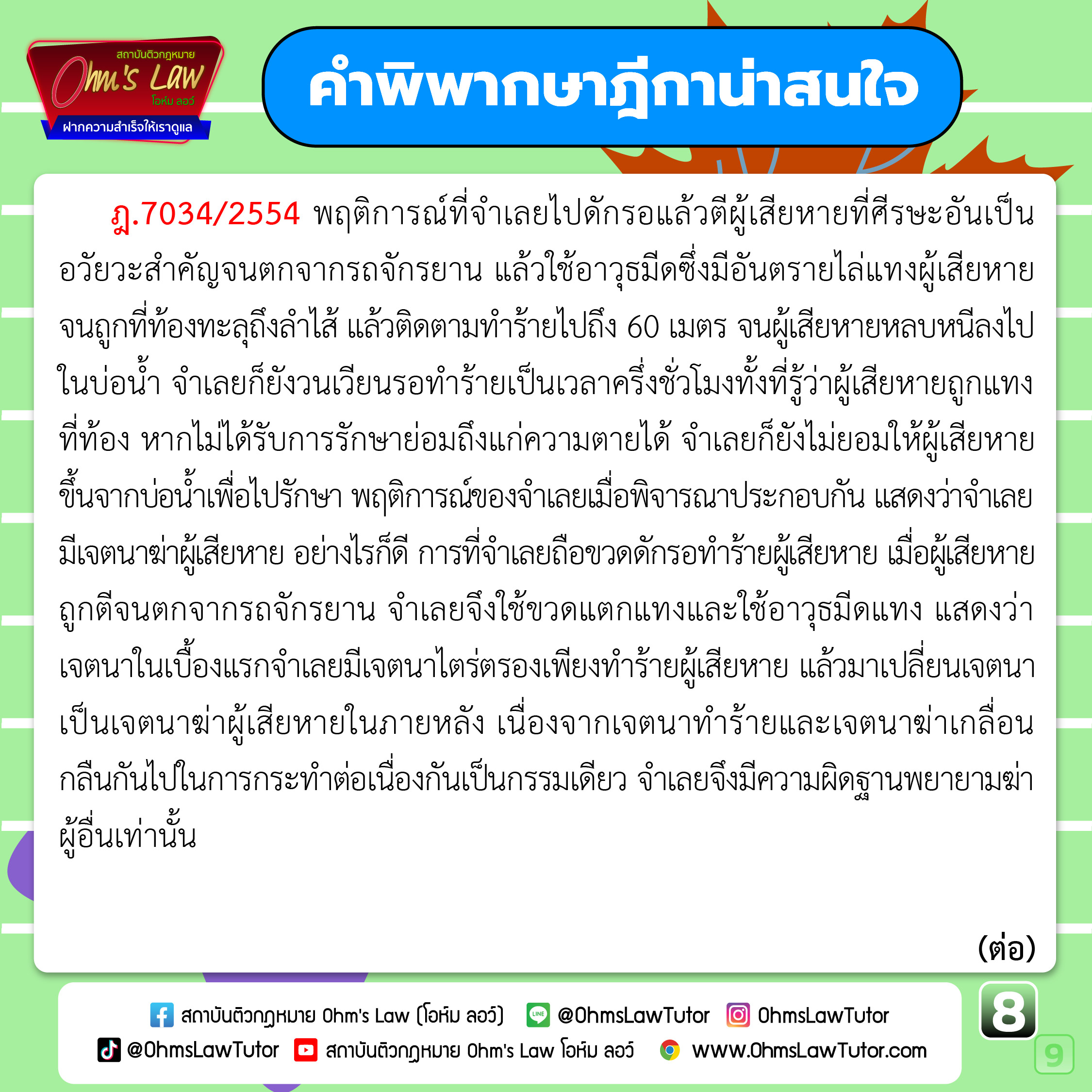 + กระทำต่ออวัยวะสำคัญ + กระทำโดยแรง/กระทำซ้ำ = เจตนาฆ่า (โดยเล็งเห็นผล)