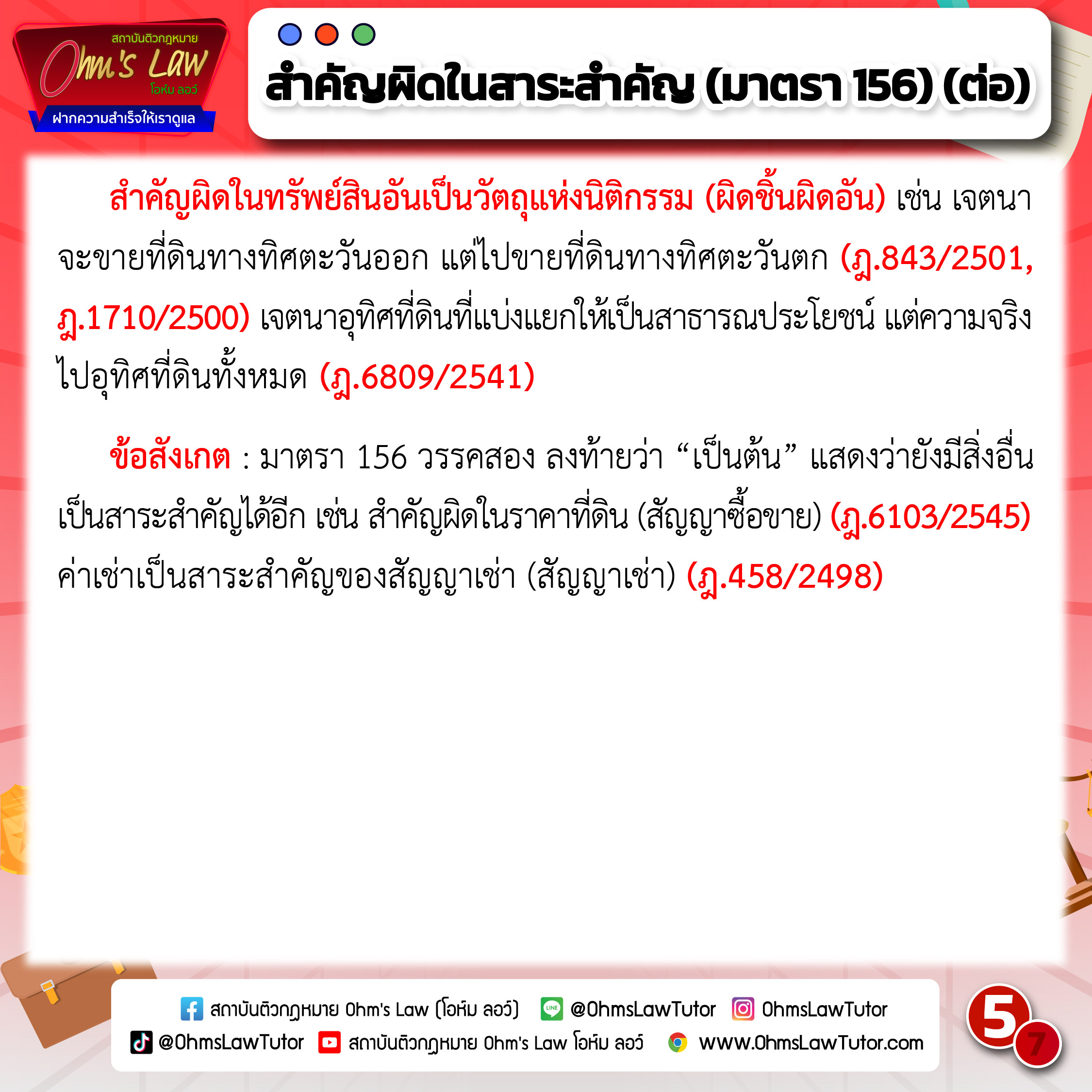 📌❔ ป.พ.พ. มาตรา 156 วรรคสอง ลงท้ายว่า "เป็นต้น" แสดงว่ายังมีเรื่องอื่นที่เป็นสาระสำคัญได้อีก เช่น สำคัญผิดในราคาที่ดิน (ฎ.6103/2545)
