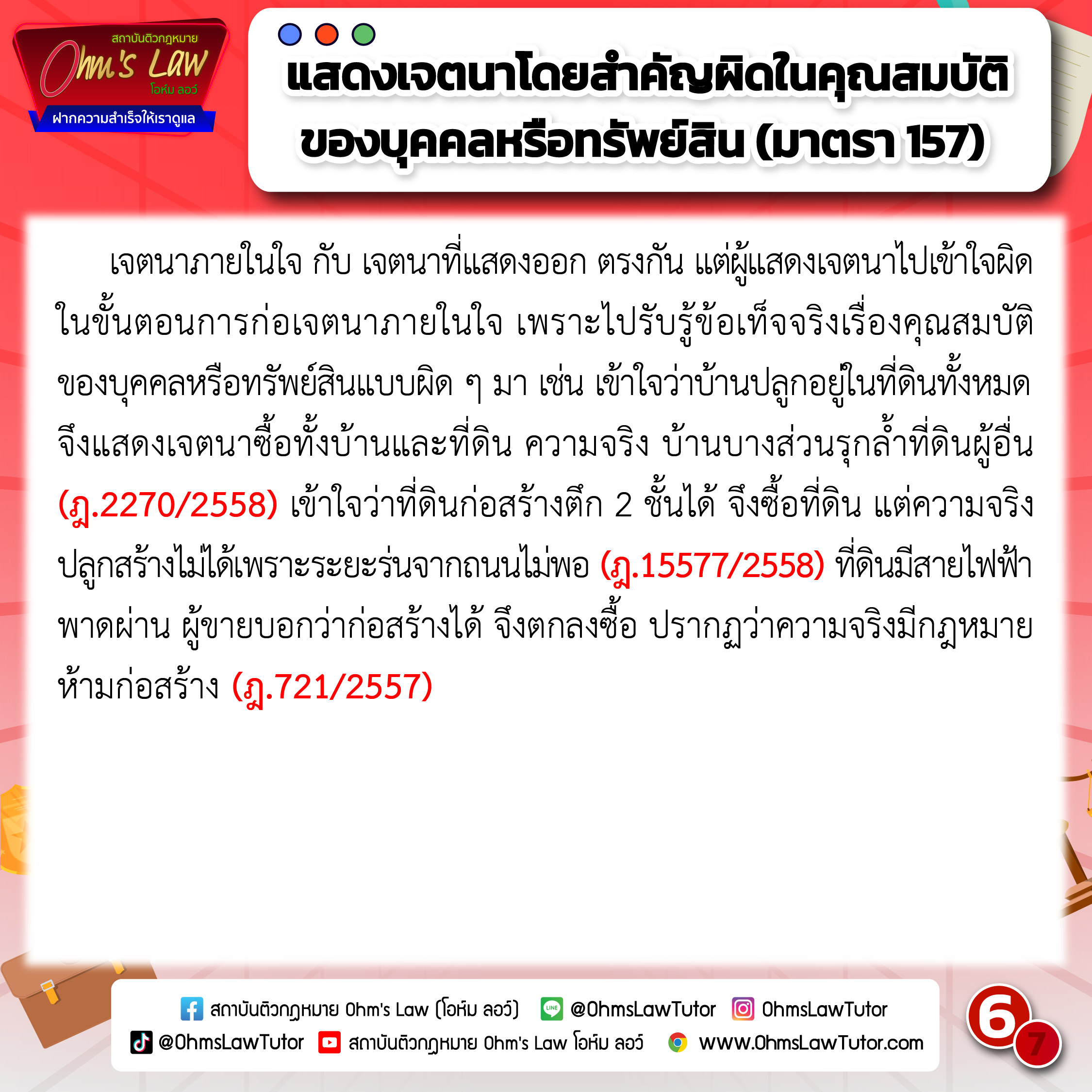 2️⃣ สำคัญผิดในคุณสมบัติของบุคคลหรือทรัพย์สินตาม ป.พ.พ. มาตรา 157 คือ ผู้แสดงเจตนารับรู้ข้อเท็จจริงเรื่องใดเรื่องหนึ่งไม่ถูกต้องและก่อเจตนาภายในใจจากข้อเท็จจริงนั้น แล้วแสดงเจตนาออกไป (สำคัญผิดในขั้นตอนการก่อเจตนาภายในใจ) เช่น ที่ดินมีสายไฟฟ้าพาดผ่าน ผู้ขายบอกว่าก่อสร้างได้ จึงตกลงซื้อ ปรากฏว่าความจริงมีกฎหมายห้ามก่อสร้าง (ฎ.721/2557)